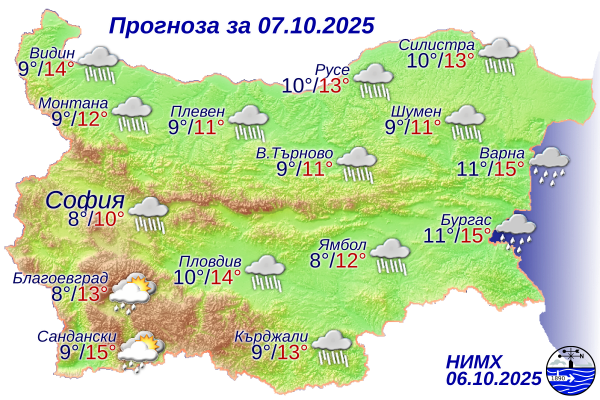 През деня ще духа умерен и временно силен вятър. Минималните температури ще бъдат между 6° и 11°, максималните – между 10° и 15°, за София – около 10°.