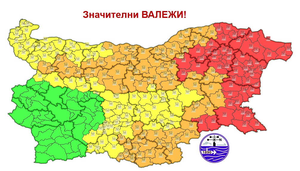 Оранжев код за дъжд е издаден за 10 области в Северна и Южна България – Враца, Ловеч, Плевен, Велико Търново, Габрово, Русе, Кърджали, Хасково, Смолян, Сливен. В други пет кодът е жълт.